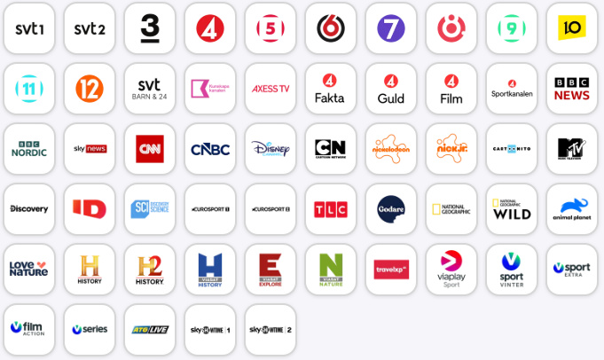 55 Tv-kanaler samt Tv4 Play Plus, HBOmax, Viaplay medium och Britbox